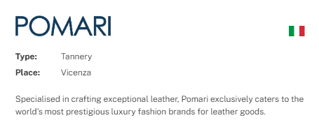 RMG Pomari는 최고급 송아지 가죽을 가공하는 이탈리아의 프리미엄 가죽 테너리로, 세계적인 럭셔리 브랜드들의 주요 공급업체로 자리 잡고 있습니다.이들이 생산하는 가죽은 높은 밀도와 부드러운 촉감을 동시에 갖춘 최고급 소재로, 다양한 클래식 및 트렌디한 컬러 구현이 가능하여H사를 비롯한 명품 브랜드에서도 널리 사용되고 있습니다.